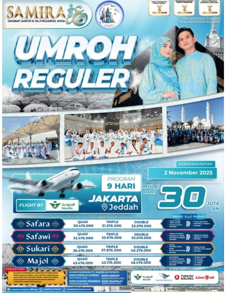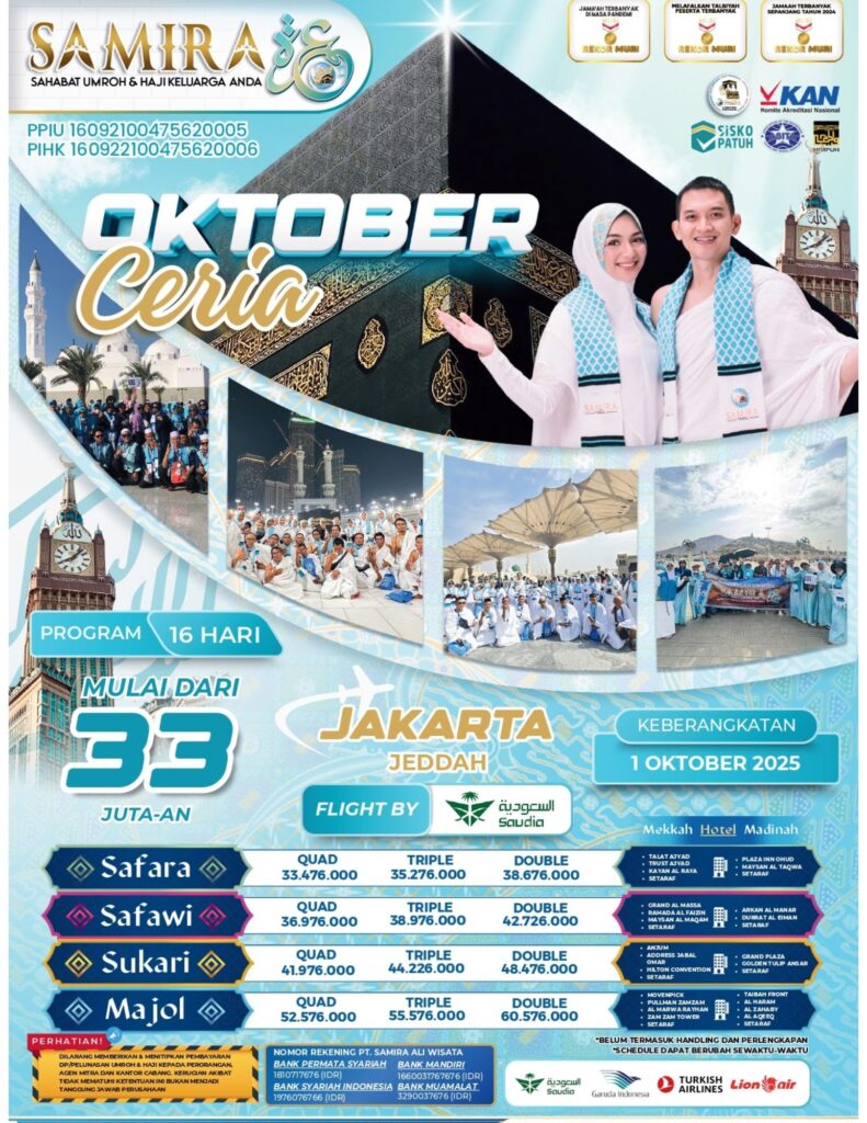 Samira Travel Jakarta terdaftar resmi di Kementerian Agama, telah memberangkatkan ribuan jamaah, dan mendapatkan banyak testimoni positif dari jamaah. Kepercayaan yang kami dapat kami bangun dari transparansi biaya, kejelasan jadwal, dan komitmen dalam menjaga kenyamanan dan keamanan jamaah.